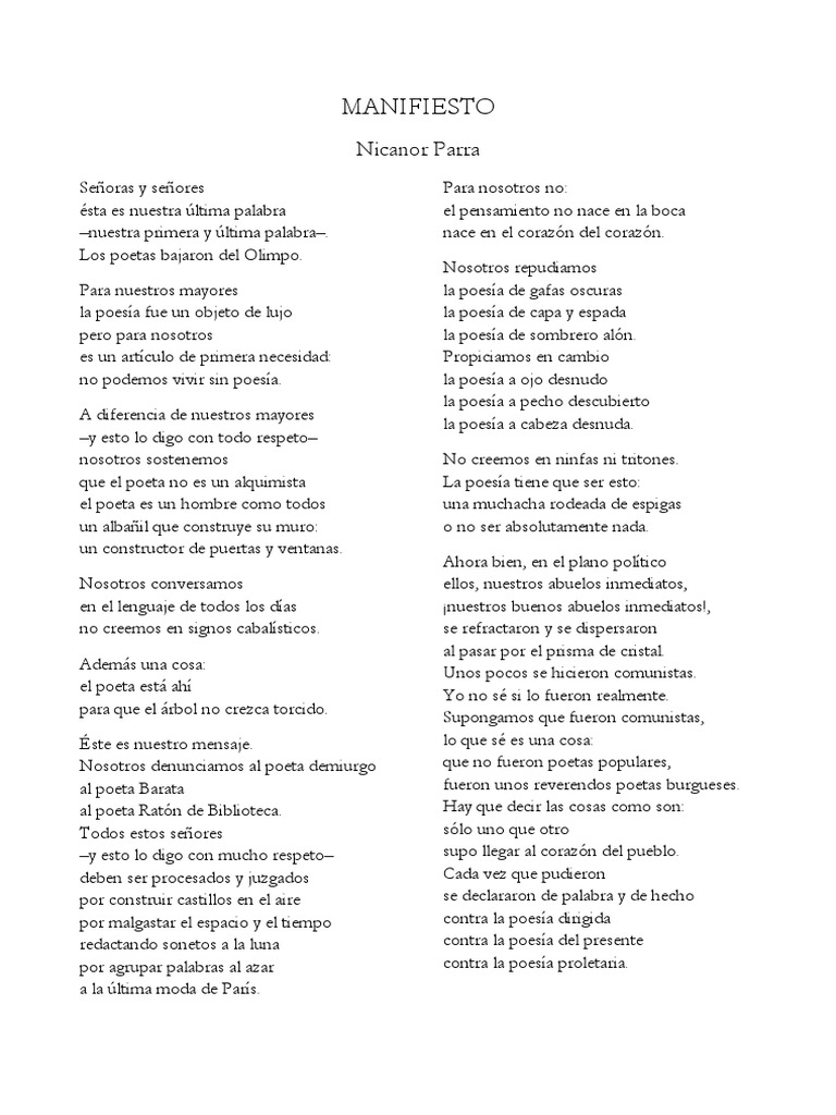 Antes me parecía todo bien, nicanor parra. On december 1, 2011, parra won the cervantes prize from spain's ministry of culture, widely considered the most important literary prize in the. To connect with nicanor parra, join facebook today. Y en las noches de luna imaginaria sueña con la mujer imaginaria que le brindó su amor imaginario y vuelve a palpitar el corazón del hombre imaginario. En este lugar de la mancha. Figura protagónica en la formación del estado, el poderoso ministro que fue asesinado en 1837 era un febril. Pero para ayudaros a esa reflexión os ofrecemos de la mano de la actriz alejandra torrae y, cómo no, de la del propio gonzalo escarpa, la dramatización del poema manifiesto de nicanor parra, autor de. Nicanor parra poems, quotations and biography on nicanor parra poet page. Lenguaje y comunicaciones profesora los profesores en este informe se analiza el poema los profesores de nicanor parra a partir de. Nicanor parra was born on september 5, 1914 in san fabián de alicom, chile as nicanor segundo parra sandoval. «nicanor parra trabajó hasta los 103, michelle bachelet está trabajando hasta hoy. Autor de tema mago oscuro 666. Nicanor parra trabajó hasta los 103 años, tenemos que potenciarnos como activos mientras la salud.